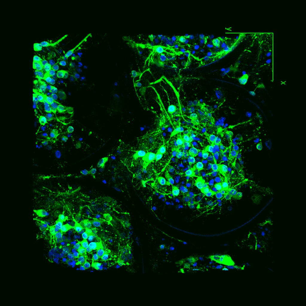 Laser fabricated scaffolds represent an attractive 3D culture platform for the development of in vitro 3D modelling tools in neuroscience. The image on the right shows a 3D human iPSC-derived neuronal network developed in a laser fabricated scaffold. Green: neurons stained with MAP2 neuronal marker; Blue: DAPI nuclear staining. 70 days in culture.
